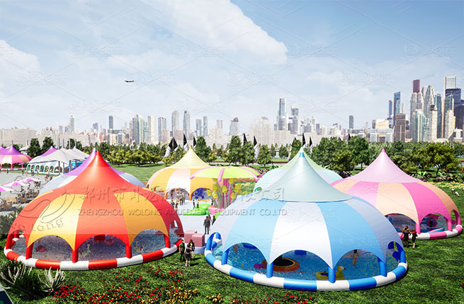遮阳棚水池便是为解决以上问题的产品。遮阳水池采用圆形的拱柱框架结构,有良好的支撑力。产品配色以亮色为主,可以单独使用也可以作为一个整体造景中的一个,相互映衬,相互组合,共同营造一个大的简约风格的造型。产品内部玩法可以多种多样,根据客户的需求具体选择,成人冲关,水滑梯,儿童冲关,多种漂浮物,水上小蹦床,水上海洋球,透明滚筒,儿童手摇船,花样戏水池等多种玩法。产品经营方式自由,可以单个、多个或组合形式皆可,不同预算的客户都能经营成园。
